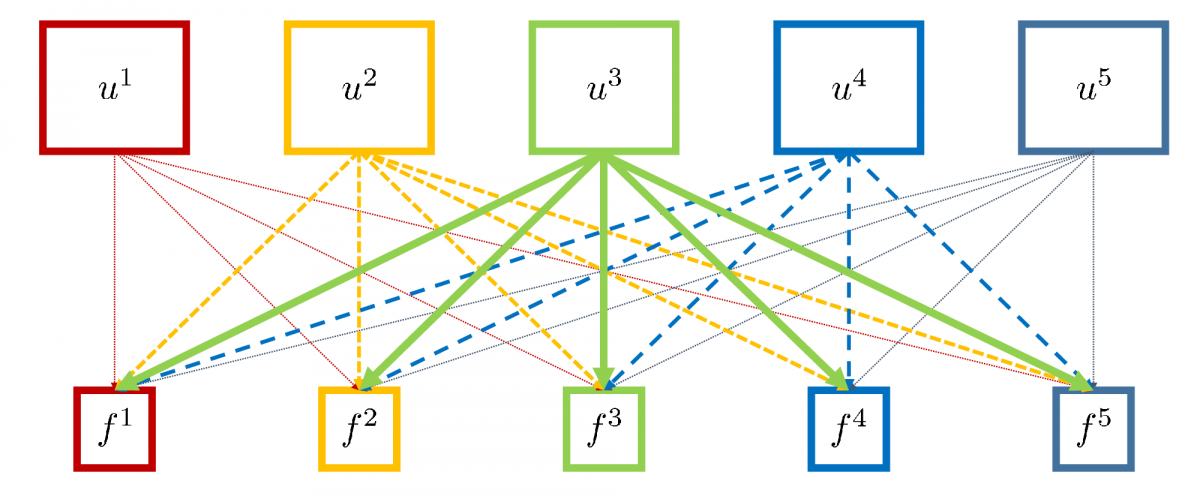 Classical approaches, e.g. Unger et al. ("A convex approach for variational superresolution"), couple all frames as in the left figure. Our approach (on the right) couples all high resolution frames directly.